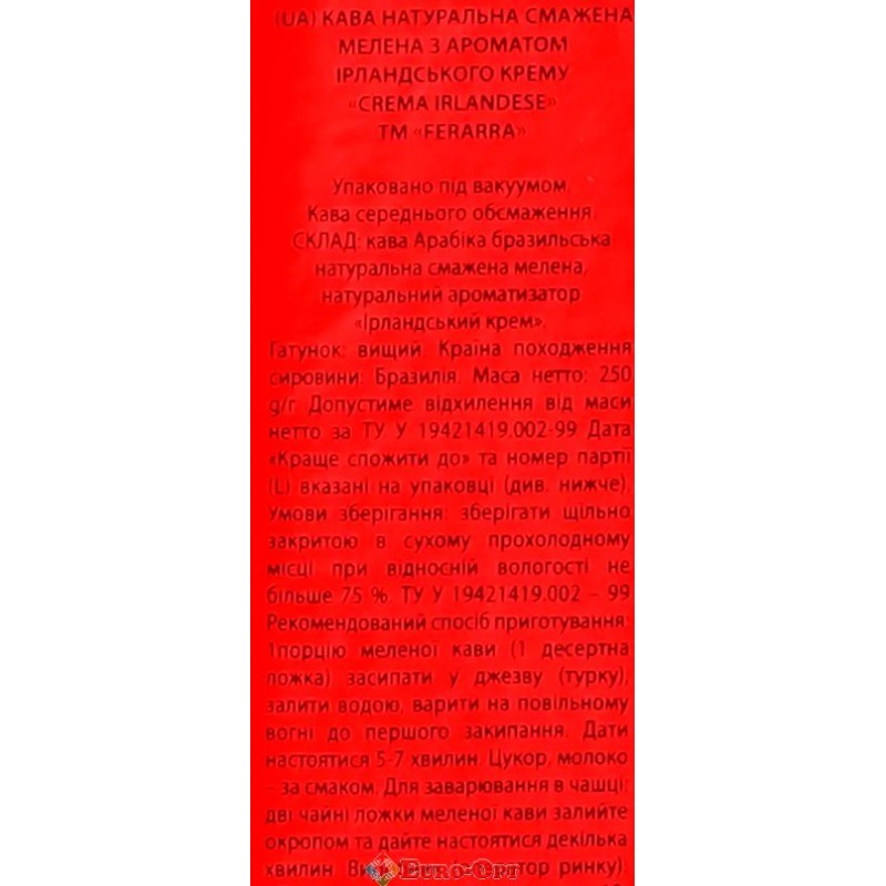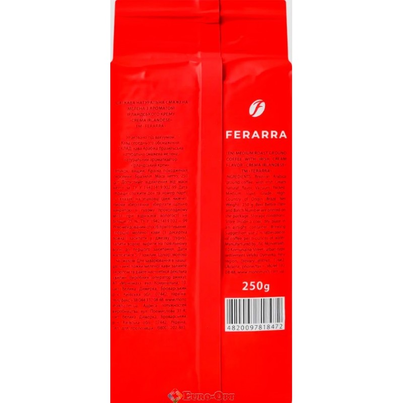 Кофе молотый Ferarra Caffe Crema Irlandese 250g. — ирландский стиль бленд средней обжарки с нежными нотами сливок, карамели и лёгкого виски-аромата. Бархатистый вкус, мягкое тело, приятное сливочное послевкусие без горечи. Идеален для эспрессо, американо, латте, кофеварок и френч-пресса. Компактная упаковка 250 г — удобно для ежедневного использования или в подарок.