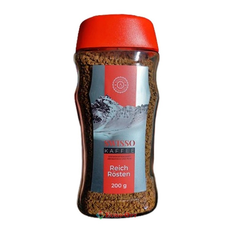 Кофе растворимый Swisso kaffee Reich Rosten 200g. — Растворимый кофе из зерен 100% арабики африканского происхождения. Кофе имеет среднюю обжарку. Отличный выбор для быстрого приготовления. Готовый напиток обладает приятным ароматом, сбалансированным вкусом, подчеркнутым цитрусовыми нотками.