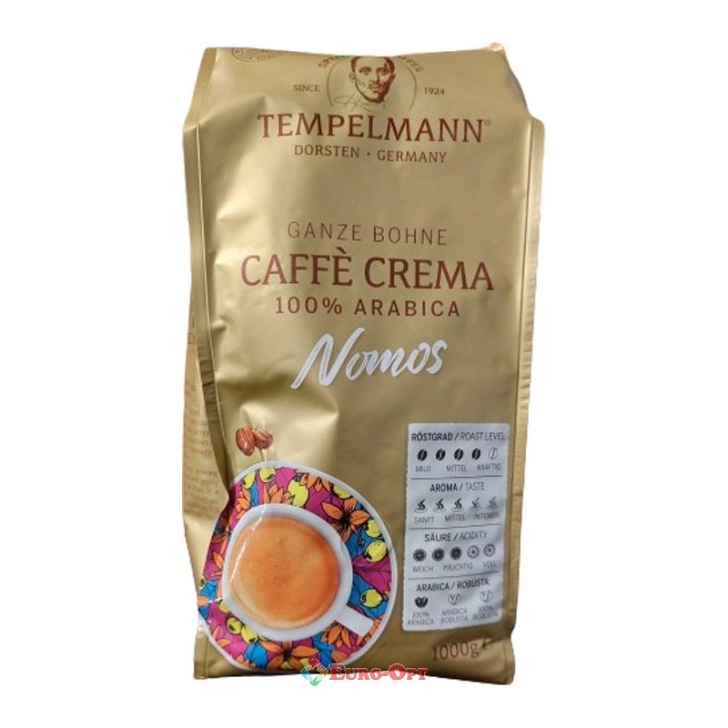 Кофе в зернах Tempelmann Caffe Crema Nomos 100% Arabica 1kg. — изысканная смесь арабики с лучших плантаций, средняя обжарка для гармоничного вкуса с нотками карамели, орехов и шоколада. Идеальна для кремового эспрессо, капучино или латте, обеспечивает насыщенный аромат и мягкую кислотность.