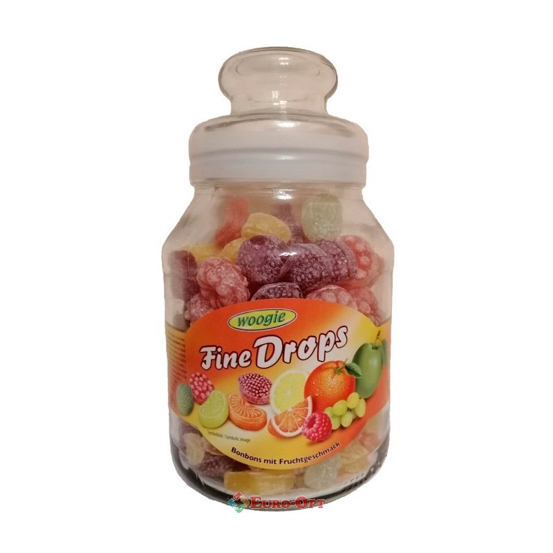 Леденцы Fine Drops Woogie Фруктовое Ассорти 300g. — фруктовый микс фруктовых леденцов со вкусом фруктов – апельсина, вишни, груши, лимона, ягод. Обладают насыщенным фруктовым вкусом и ароматом, вариант сладкого лакомства для детей и взрослых. Удобный формат упаковки: стеклянная банка с крышкой надежно сохраняет благоухание леденцов.