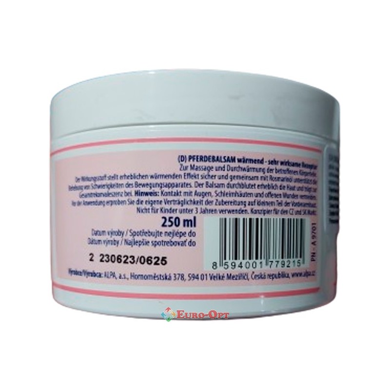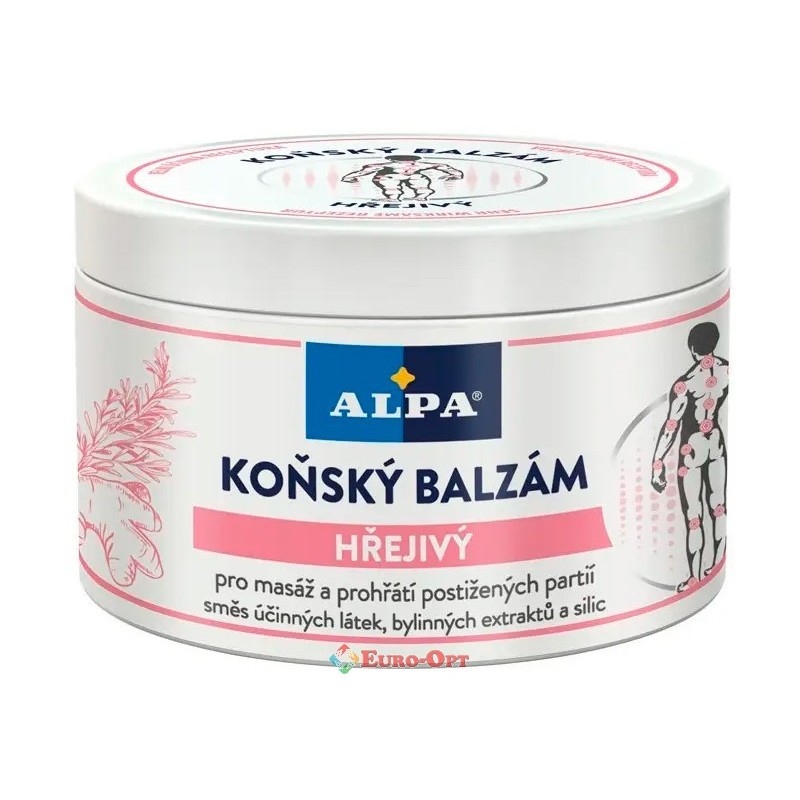 Конский Бальзам с Перцем Согревающий Alpa Konsky balzam Hrejivy 250ml. — обеспечивает значительный согревающий эффект и вместе с розмарином способствует уменьшению боли в суставах и спине и устранению проблем, связанных с артритом, воспалениям сухожилий и ревматизмом. Способствует релаксации и потоку крови к коже и ускоряет восстановление.