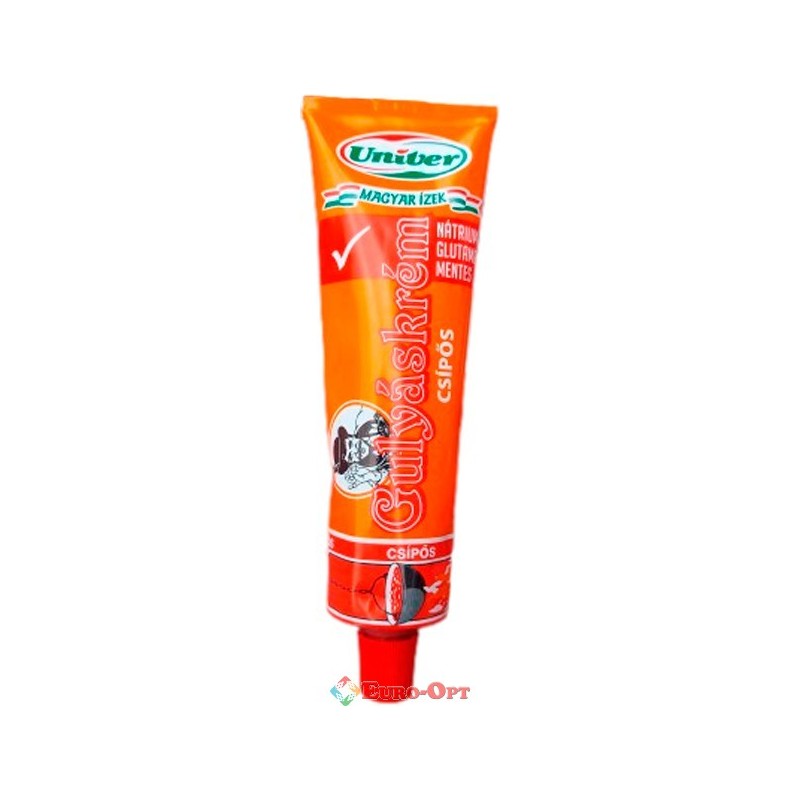 Соус острый для бограча и гуляша Univer Gulyaskrem Csípős 160g. — пикантная, очень ароматная, красновато-коричневого цвета. Соус усиливает аромат и придает пикантный вкус гуляшу или подливке. Особенность пасты Gulyáskrém состоит в сочетании острого перца-паприки (с минимальным содержанием капсаицина), репчатого лука, томатов, тмина и лаврового листа.