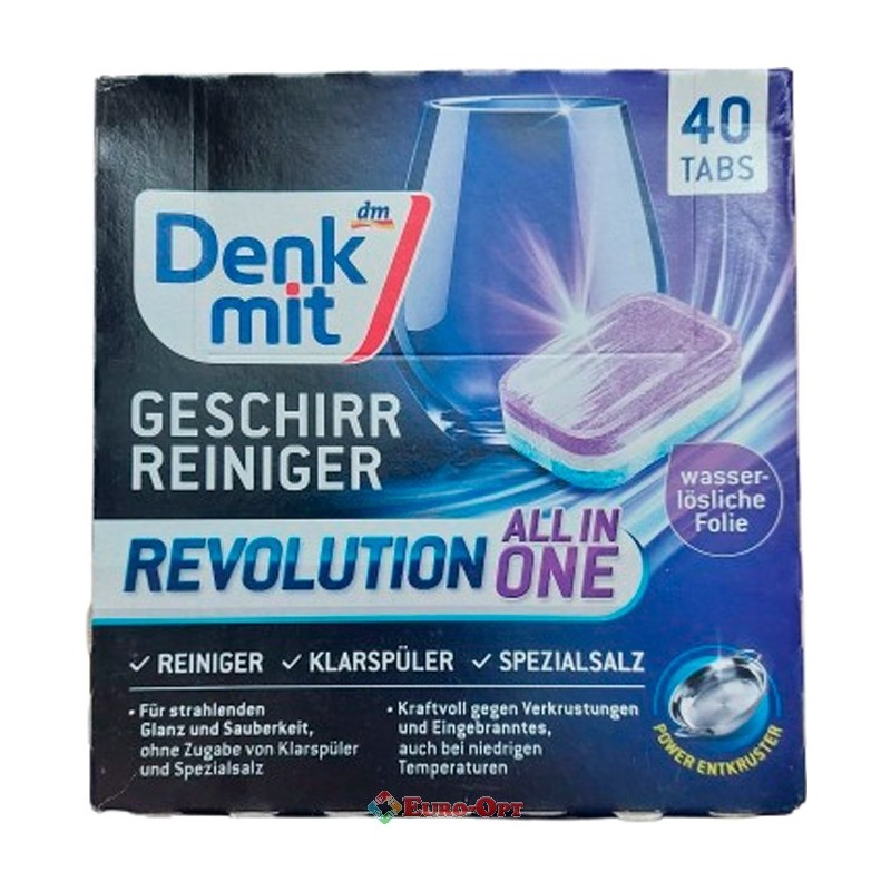 Таблетки для Посудомоечных Машин Denkmit Geschirr-Reiniger Multi-Power Revolution 40 tabs — революционная формула эффективно очищает грязную посуду, придает ей чистый сияющий вид, при этом сохраняя художественные узоры на посуде. Специальная соль придает сияющий блеск, противодействует пятнам от воды и образованию известковой накипи. Препятствует естественному помутнению стеклянной посуды.