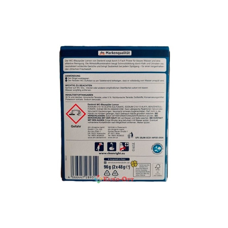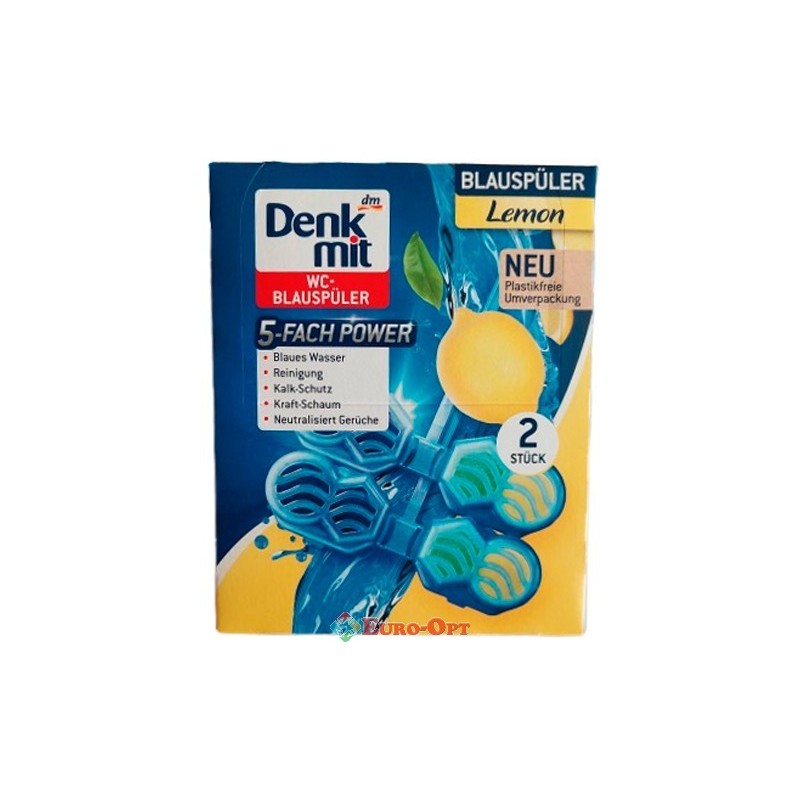 Подвесной блок для унитаза DenkMit WC-Blauspüler Lemon Splash 96g. (2шт.) – это средство для очищения и освежения унитаза с приятным лимонным ароматом. Блок имеет уникальную форму, которая позволяет дольше держаться в унитазе и дозирует чистящее средство постепенно, каждый раз, когда вода сбрасывается.