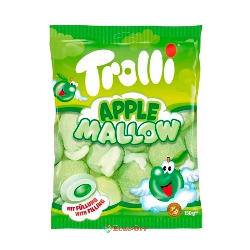 Цукерки Troli Apple Mallow 150g. — ніжні зефірні цукерки з яскравим яблучним смаком. Повітряна м’яка текстура, соковита кисло-солодка начинка, приємний аромат свіжих яблук. Ідеальний десерт для дітей і дорослих, чудово підходить до чаю чи кави.
