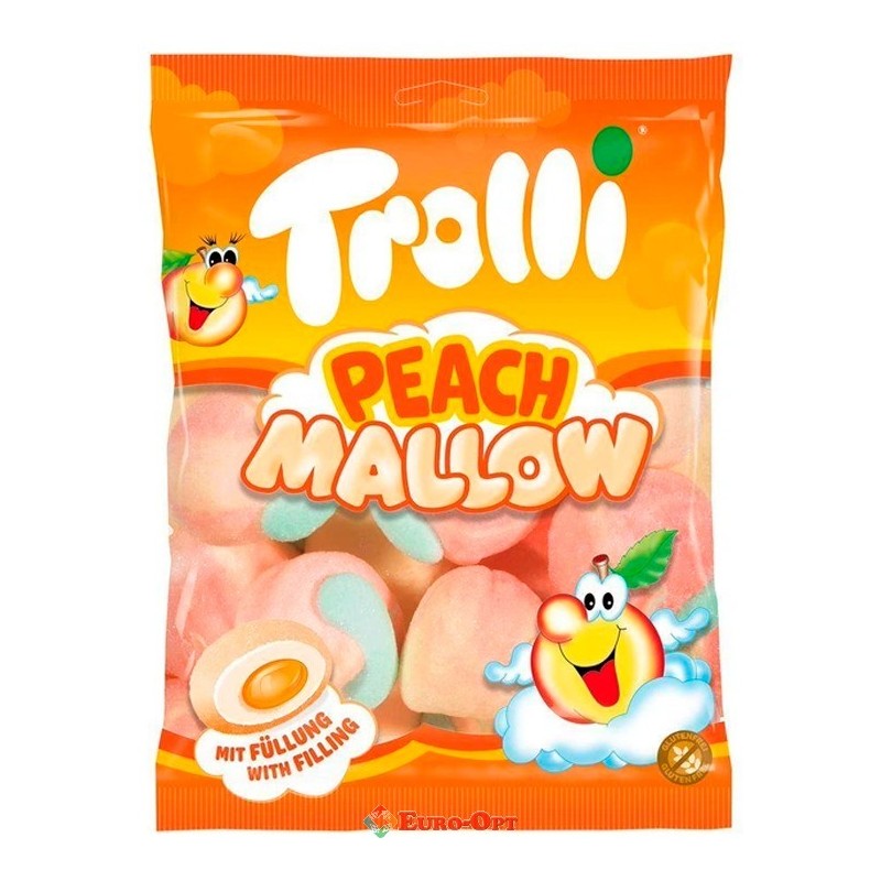 Цукерки Troli Peach Mallow 150g. — ніжні зефірні цукерки зі смаком соковитого персика. Повітряна м’яка текстура, яскрава фруктова начинка та легка солодкість. Чудовий десерт до чаю, ідеальні для святкового столу чи подарунка.