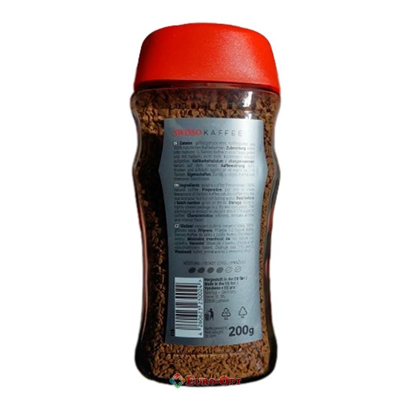 Кава розчинна Swisso kaffee Reich Rosten 200g. — Розчинна кава з зерен 100% арабіки африканського походження. Кава має середнє обсмажування. Відмінний вибір для швидкого приготування. Готовий напій має приємний аромат, збалансований смак, підкреслений цитрусовими нотками.