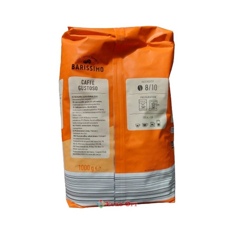 Кава в зернах Barissimo Caffe Gustoso (Барисімо Кафе Густосо) 1kg. — інтенсивний смак та стійка густа пінка при приготуванні еспресо. Міцність кави 8 з 10. Під час приготування дає пінку. Ідеально підходить для приготування різноманітних кавових напоїв.