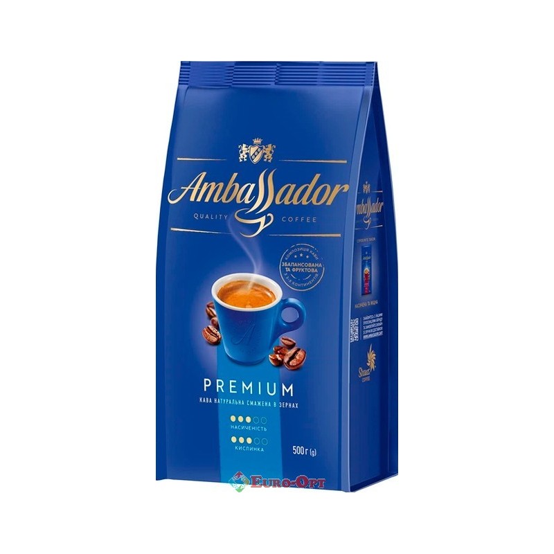 Кава в зернах Ambassador Premium 500g. — преміальний 100% арабіка середньо-темної обсмажки. Насичений, оксамитовий смак з нотами темного шоколаду, карамелі, смаженого горіха та легкої фруктової кислинки. Густе тіло, щільна крема, стійкий аромат. Ідеальна для еспресо, американо, кавоварок і домашнього використання.