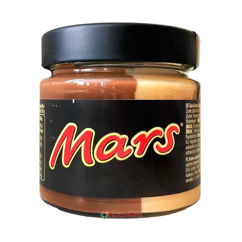 Паста шоколадна Mars 200g. — ніжна кремова паста з насиченим смаком класичного батончика Mars: молочний шоколад, карамель, нуга та легка горіхова нотка. Гладка текстура, легко мажеться на хліб, млинці, вафлі, тости чи просто їсти ложкою. Ідеальна для сніданку, перекусу, випічки, десертів чи подарунка.