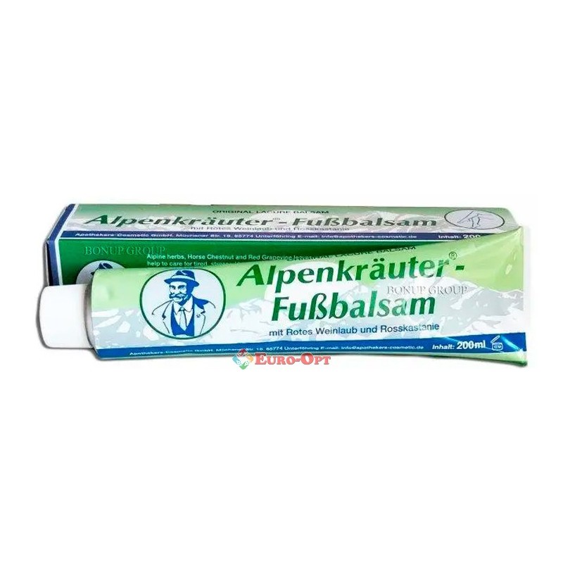 Бальзам для ніг Alpenkrauter-Fubalsam (Альпенкраутер Альпійські Трави) 200ml. – містять поживні речовини, які були зібрані разом для догляду за втомленими ногами, зняття втоми ніг, зняття напруги, поліпшення кровопостачання, підтримки здорового тонусу вен. Бальзам особливо підходить тим, хто змушений багато стояти або сидіти, масажуючи ноги цим бальзамом, покращується кровопостачання ніг.