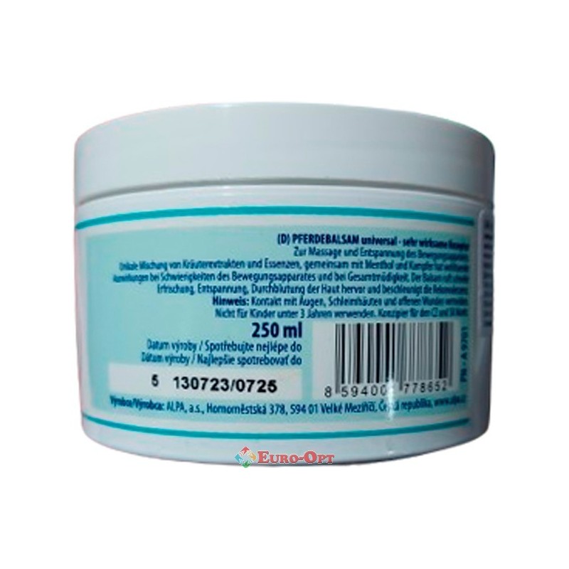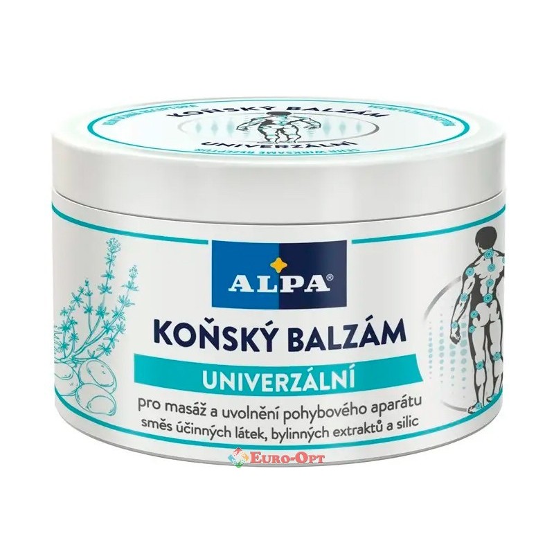 Кінський Бальзам Універсальний Охолоджуючий Alpa Konsky Balzam Univerzalni 250ml. — широко відомий засіб, призначений для ефективної допомоги після будь-якого фізичного або спортивного навантаження. Дієво допомагає і в період реабілітації після переломів і лікування забитих місць. Містить цілий ряд ефірних масел різних трав і екстрактів з анестезуючими і розслабляючими властивостями.