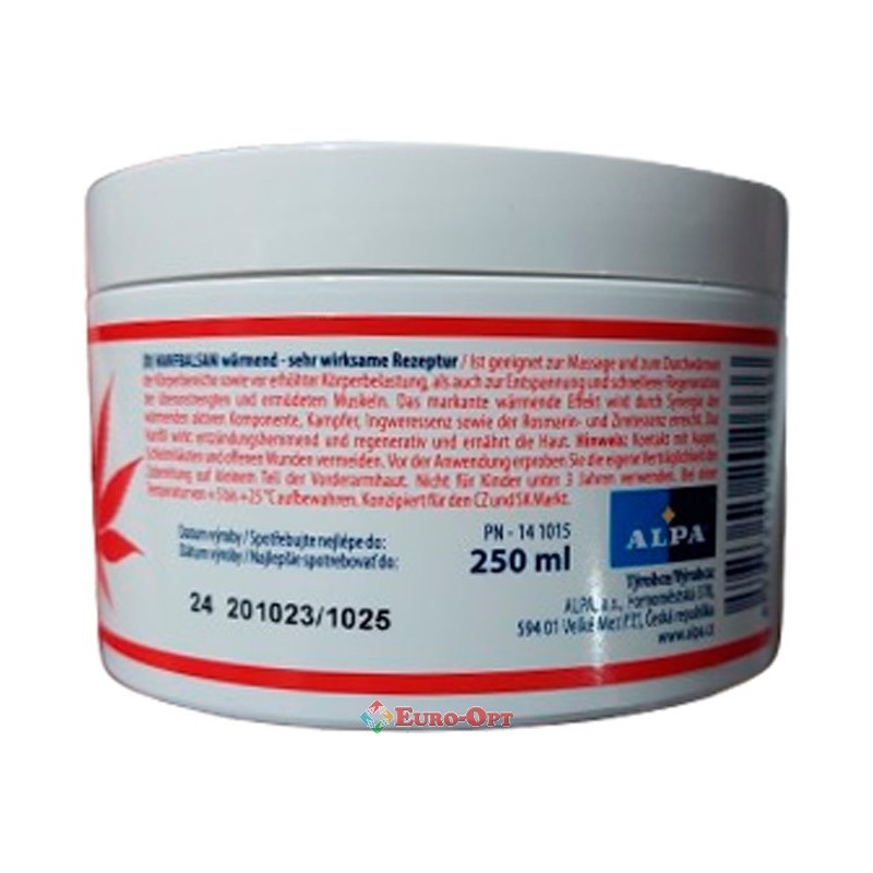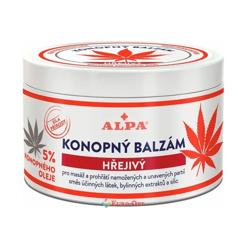 Бальзам Зігріваючий з Коноплею Alpa Konopny Balzam Hrejivy 250ml. — підходить для масажу та розминки частин тіла як перед підвищеними фізичними навантаженнями, так і для розслаблення та швидшої регенерації напружених і втомлених м’язів. Значний зігріваючий ефект досягається з інергією зігріваючої діючої речовини, камфори, екстракту імбиру та ефірної олії розмарину та кориці.