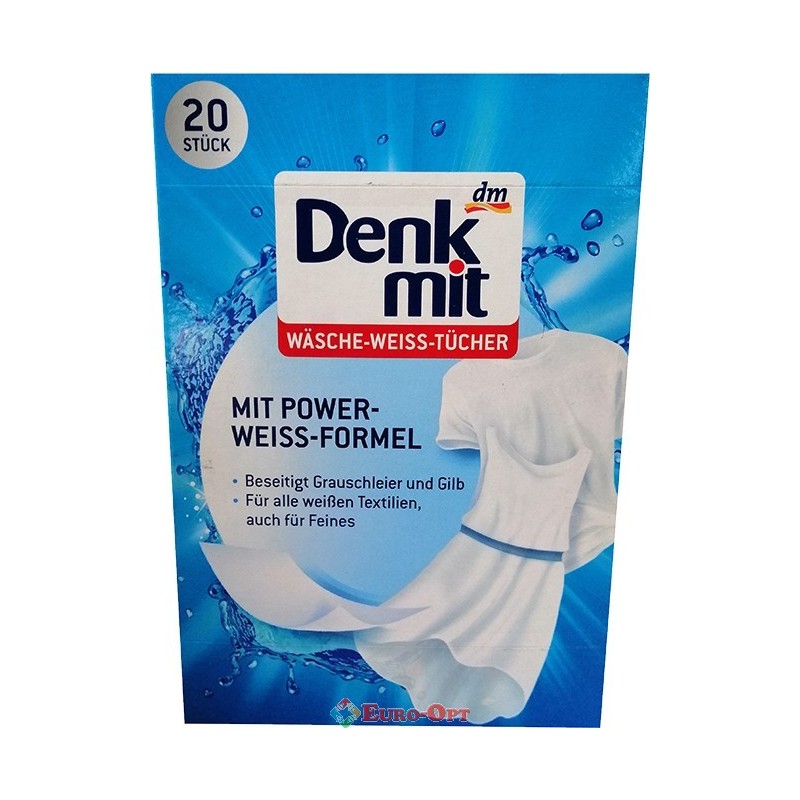 Серветки для Прання Білих Тканин Denkmit Wäsche-Weiss Tücher 20 pcs — це спеціальні серветки для прання білих та світлих тканин. Серветки для прання білих тканин ефективно усуває жовтий і сірий наліт, що з'явилися. Принцип дії серветки дуже простий - вона поглинає найменші частинки бруду та фарби.