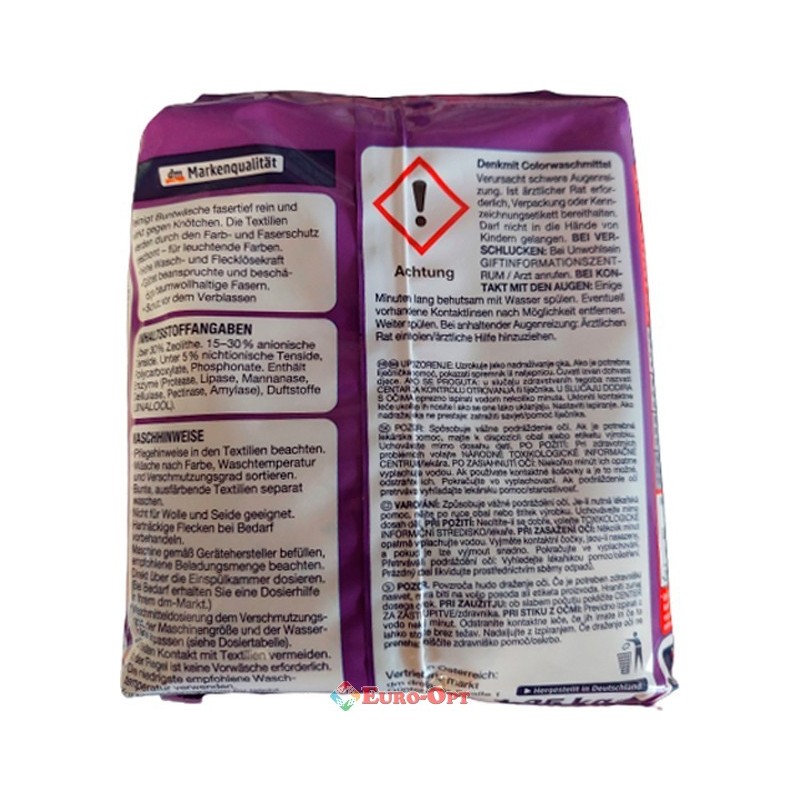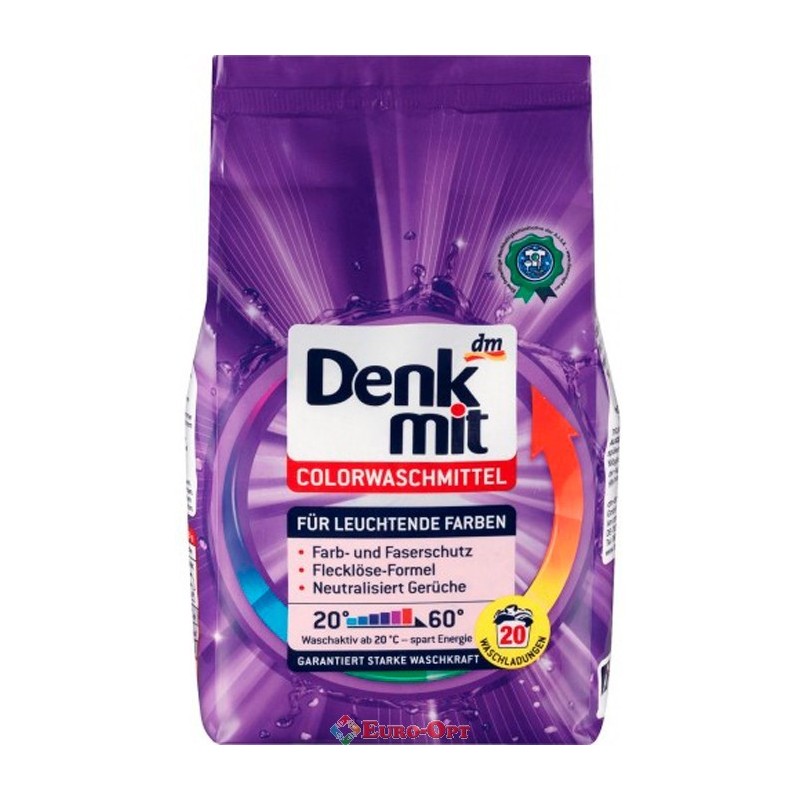 Пральний порошок Denkmit Colorwaschmittel (20 прань) 1.35kg. ― пральний порошок для кольорової білизни. Відмінний захист фарб і висока розчинність жиру. Містить біодобавки - ензими для виведення плям, ніжні ароматичні добавки і захист пральної машини від утворення вапняного нальоту і накипу. Починає свою дію вже при 20 С.