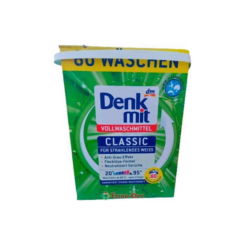Пральний порошок Denkmit Vollwaschmittel Classic (80 прань) ― пральний порошок для будь-якої білизни. Сильнодіючий концентрований миючий засіб для сильно забрудненої білизни, що дозволяє його економно використовувати. Глибоко проникаючи в волокна тканини він максимально відпирає бруд і застарілі плями. Підходить як для ручного, так і для машинного прання.