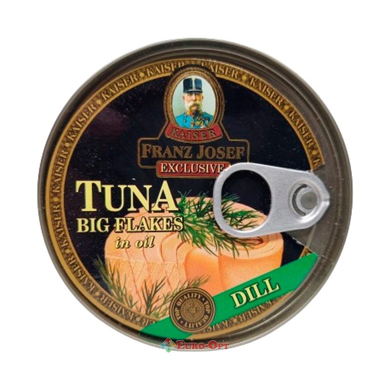 Тунець в олії Franz Josef Tuna Big Flakes In Oil Dill 170g. ― прекрасне поєднання цільного тунця з олією і укропом. Тонкий аромат, ніжний смак і безліч корисних речовин в одній банці.
