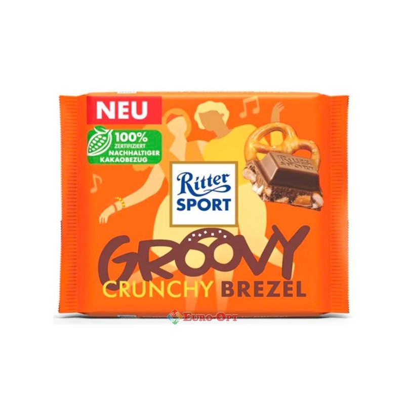 Шоколад Ritter Sport Crunchy Brezel 100g. — молочний шоколад із хрусткими шматочками солоних брецелів для поціновувачів контрастних смаків. Ідеальний як солодкий перекус або частування до кави чи чаю, дарує неповторну гармонію солодкого й солоного.
