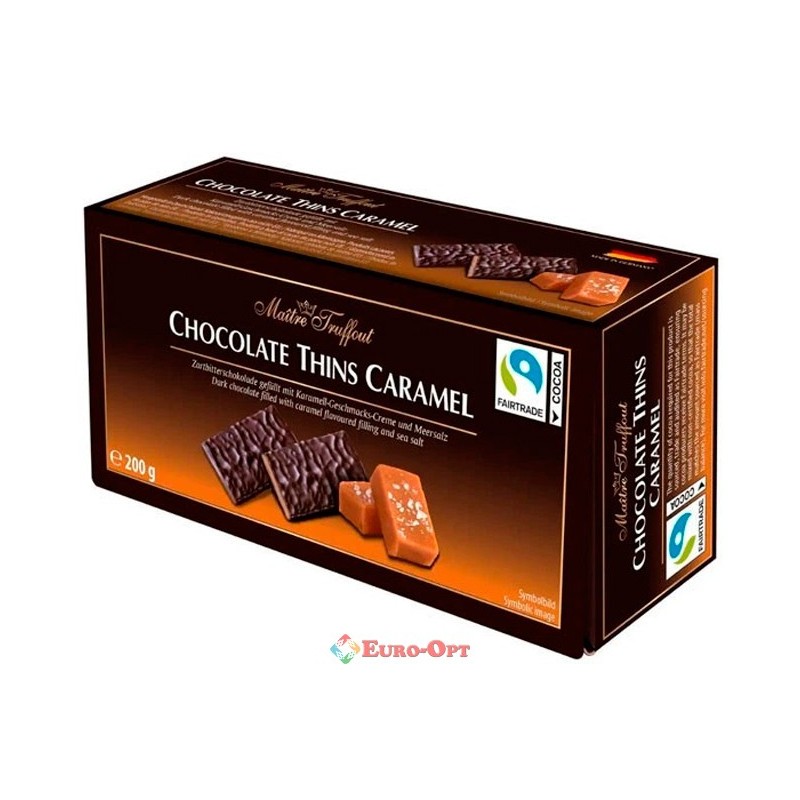 Шоколад Maitre Truffout Thins Caramel 200g. — тонкі скибочки вершкового молочного шоколаду з ніжною карамеллю всередині, що тане в роті. Ідеальний для солодкого перекусу, частування гостей або як приємний додаток до кави чи чаю.