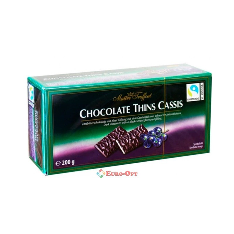 Шоколад Maitre Truffout Thins Cassis 200g. — тонкі хрусткі шоколадні пластини з ніжним смаком чорної смородини (cassis). Ніжний молочний шоколад ідеально поєднується з яскравою ягідною ноткою. Легко ламається, дуже смачно з кавою чи чаєм. Чудовий подарунок або солодке доповнення до вечора.