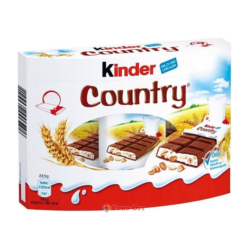 Шоколадні батончики Kinder Country 9шт. 211.5г — хрусткі вафельні батончики з молочним шоколадом, кокосом, хрусткими кукурудзяними пластівцями та какао. Легкий, повітряний смак, приємна солодкість і хруст. Ідеальні для перекусу, дітей, подарунка, школи чи просто до чаю.