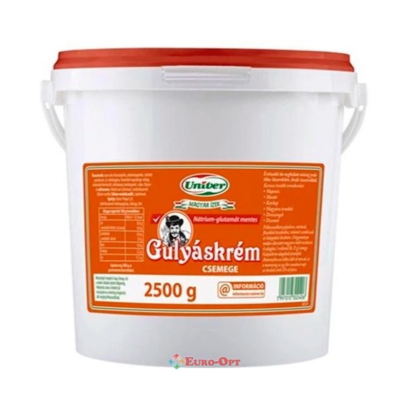 Соус солодкий для бограча та гуляшу Univer Gulyaskrem Csemege 2.5кг — готовий класичний угорський соус для справжнього бограчу, гуляшу та інших тушкованих страв. Насичений смак паприки, томатів, цибулі та спецій, легка солодкувата нотка. Зручний у використанні: просто додайте до м’яса та овочів. Велика банка 2.5 кг ідеальна для кафе, ресторанів або великої родини.