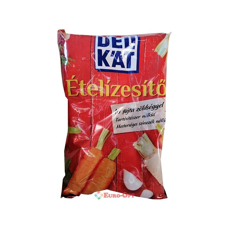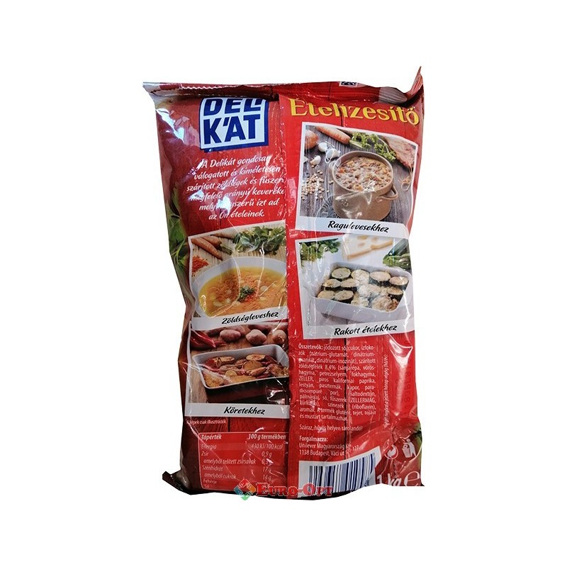 Приправа Delikat Etelizesito 1kg — Містить 10 видів овочів та спецій: морква, цибуля, зелень петрушки, часник, селера, любисток, червоний перець, пастернак, кріп, помідори. Без консервантів. Виготовлена із застосуванням спеціальних технологій сушіння, що забезпечують збереження ароматів та корисних властивостей усіх компонентів.