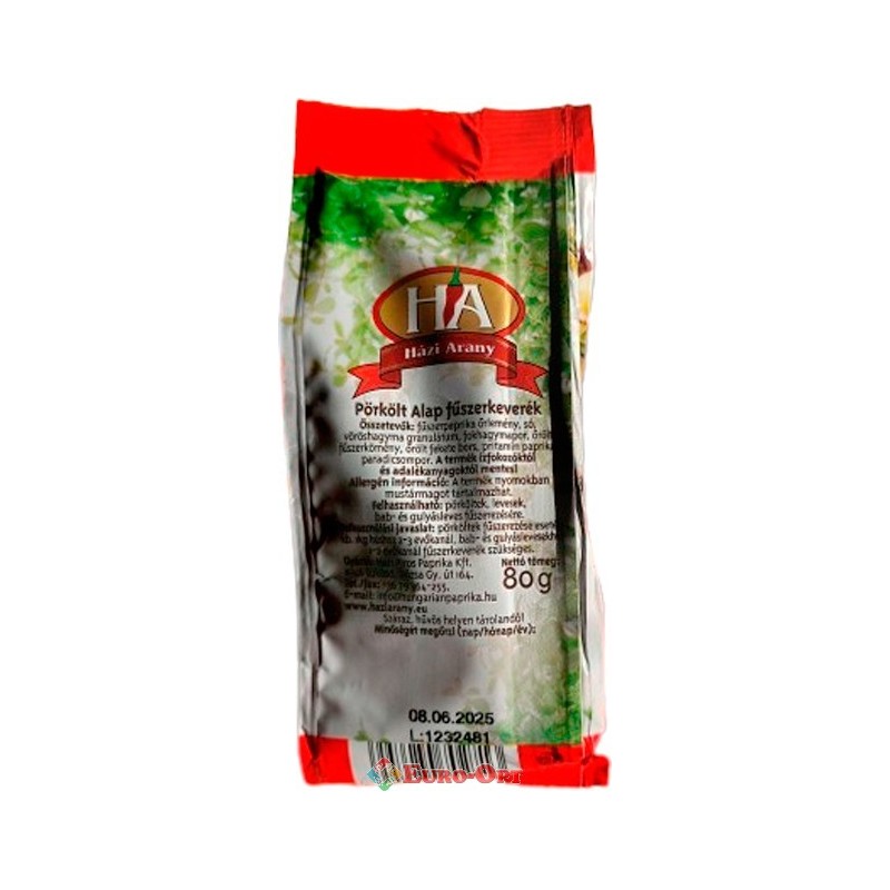 Приправа до Бограчу і Гуляша Házi Arany Pörköltalap Fűszerkeverék 80g. — суміш спецій для приготування бограч-гуляшу. Прекрасно поєднується з різними м'ясними та овочевими стравами. Використовується для приготування соусів. Містить: часник, паприка, цибуля, томати в'ялені, порошок томатний, чорний перець, сіль, кмин.