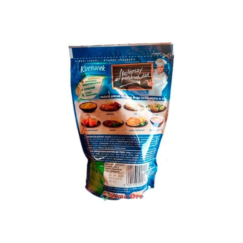 Приправа Kucharek Кухарек 200g. — це ретельно підібрана суміш, яка надасть незабутнього смаку будь-яким вашим стравам. Овочева приправа ідеально підійде для супів, м'ясних і рибних страв. Додайте приправу і кухню наповнить пікантний аромат свіжої зелені. Приправу додавати на смак не менше ніж за 5 хв до готовності страви. Радуйте близьких ароматами літа цілий рік.