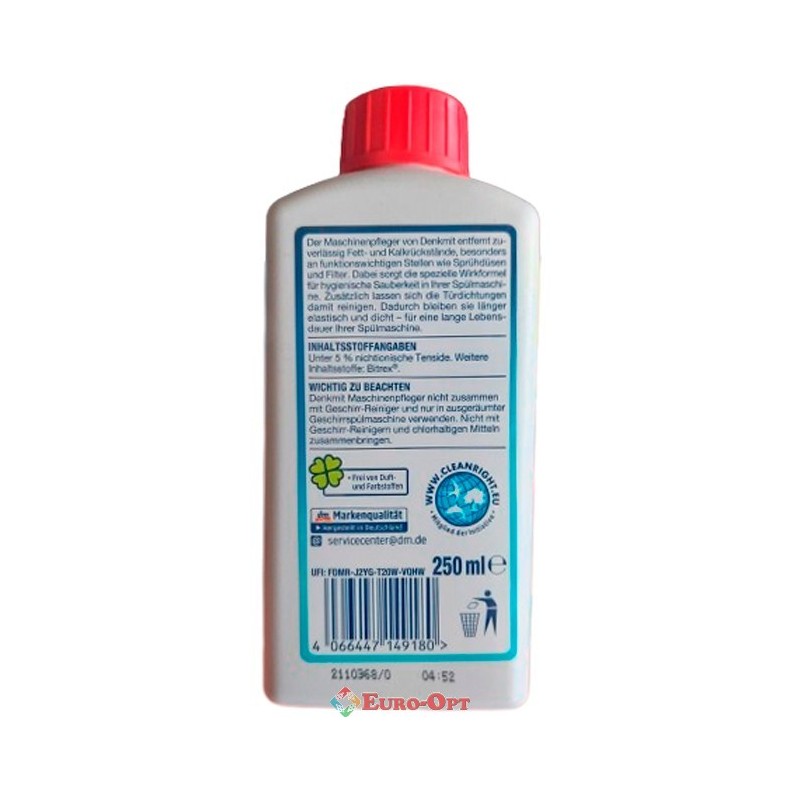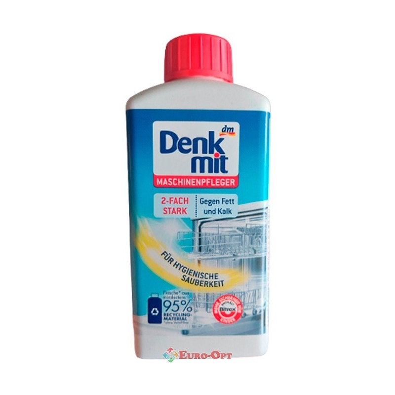 Очищувач для посудомийних машин Denkmit Maschinenpfleger 2-Fach Stark 250ml. — це спеціальний засіб для усунення залишків жиру та вапна у посудомийних машинах. Інтенсивний очищувач Денкміт дуже ефективний в очищенні всередині приладу від нальотів, скупченої від жиру накипу та інших забруднень. Завдяки регулярному очищенню ви продовжите термін використання посудомийної машини.