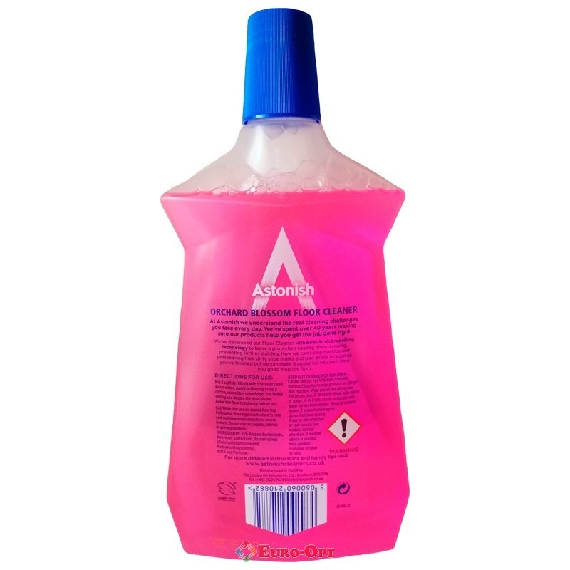 Засіб для миття Полів Astonish Floor Cleaner Orchard Blossom 1000ml. — Астоніш для миття підлоги м'яко очищає і захищає поверхню, видаляючи бруд і жир. Не потребує додаткового змивання. Видаляє бруд, очищає до блиску. За допомогою брудовідштовхуючих технологій залишає захисне покриття після очищення.