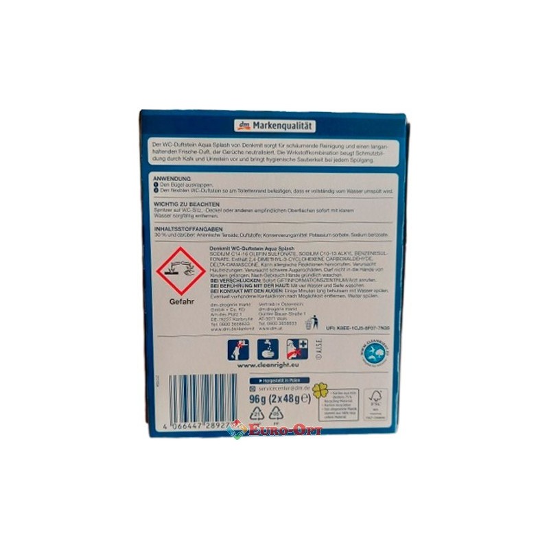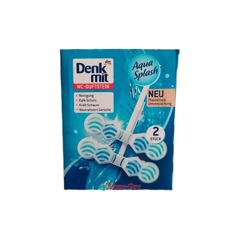 Підвісний Блок для Унітаза DenkMit WC-Duftstein Aqua Splash 96g. (2шт.) – туалетний ароматичний блок Denkmit з приємним свіжим ароматом видаляє неприємні запахи. Його очищаюча формула запобігає утворенню нового бруду, вапняного нальоту та накипу. Для гігієнічної чистоти і приємної свіжості після кожного змиву.