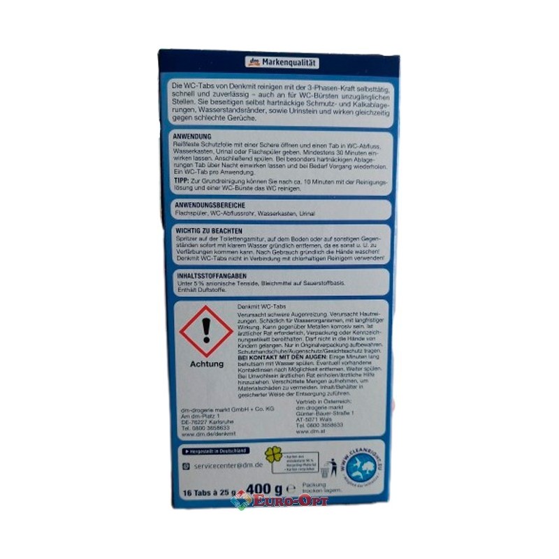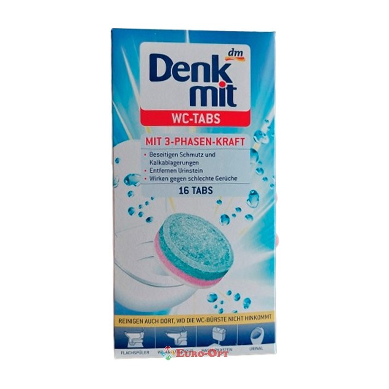 Таблетки для Чищення Унітаза DenkMit 16 WC-Tabs 400g. – таблетки для чищення унітазу, в місцях, де не можна очистити щіткою. Підфарбовує, освіжає. Чистить та запобігає утворенню вапняного нальоту. Забезпечує чистоту та свіжість на кілька тижнів.