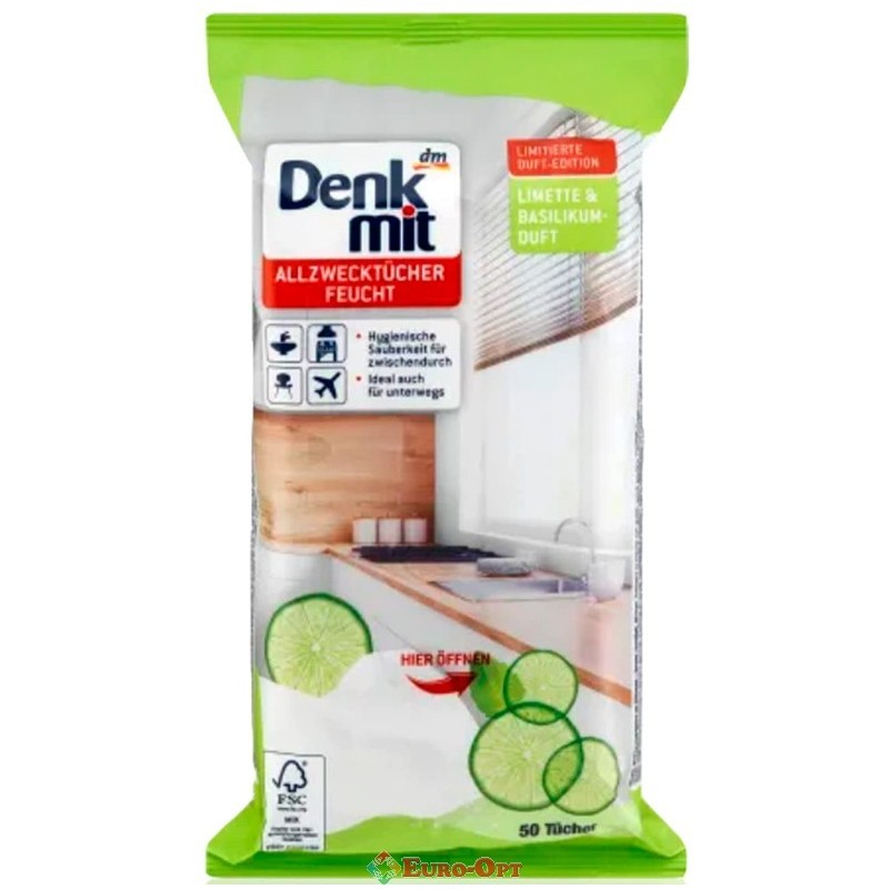 Вологі Серветки Denkmit Feuchte Allzwecktücher Limette & Basilikum Duft 50шт. — універсальні вологі серветки з літнім ароматом лимону та базиліку ідеально підходять для швидкого та легкого прибирання у проміжках будинку та в дорозі. Ефективна миюча формула потужно очищає миття поверхні одним протиранням – для гігієнічної чистоти та свіжості. Сприйнятливість шкіри дерматологічно протестована.